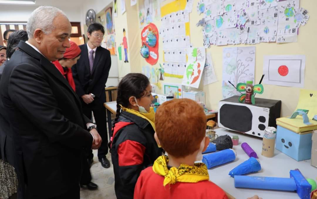 وتفقد الوزير والسفير والوفد المرافق له فصول المدرسة، وشاهد الوزير تطبيقًا لأنشطة التوكاتسو التي تلقاها الطلاب خلال الفصل الدراسي الأول ومنها نشاط التنظيف لطلاب KG2.