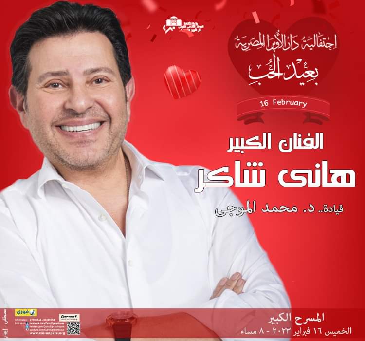 يحيي أمير الغناء العربي المطرب الكبير هاني شاكر حفل غنائي كبير في دار الأوبرا المصرية يوم الخميس الموافق 16 فبراير، في تمام الساعة الثامنة مساءًا، بقيادة المايسترو دكتور محمد الموجي.