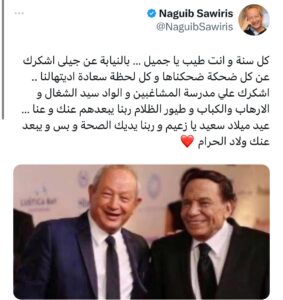 هنئ العديد من الفانين الزعيم عادل إمام بعيد ميلاده عبر تغريدات على تويتر وتعليقات على صور الزعيم، من ضمنهم احتفل نجيب سويرس خلال تغريدة، قائلاً:”كل سنة و انت طيب يا جميل بالنيابة عن جيلى اشكرك عن كل ضحكة ضحكناها و كل لحظة سعادة اديتهالنا، اشكرك علي مدرسة المشاغبين و الواد سيد الشغال و الارهاب والكباب و طيور الظلام ربنا يبعدهم عنك و عنا، عيد ميلاد سعيد يا زعيم و ربنا يديك الصحة و بس و يبعد عنك ولاد الحرام “.