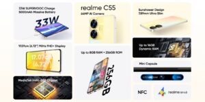 يتميز هاتف realme C55 الجديد الذي يعتبر أول هاتف من ريلمي يدعم خاصية الـ Dynamic Island بمعالج ميديا تيك الـ Helio G88 وبكاميرات خلفية تصل إلى 64 ميجا بكسل وشاشة من نوع IPS ولكن بدقة FHD+ الداعمه لمعدل التحديث الـ 90Hz، فضلاً عن بطارية عملاقة بسعة 5000 مللي أمبير مع شحن سريع بقوة 33 واط.