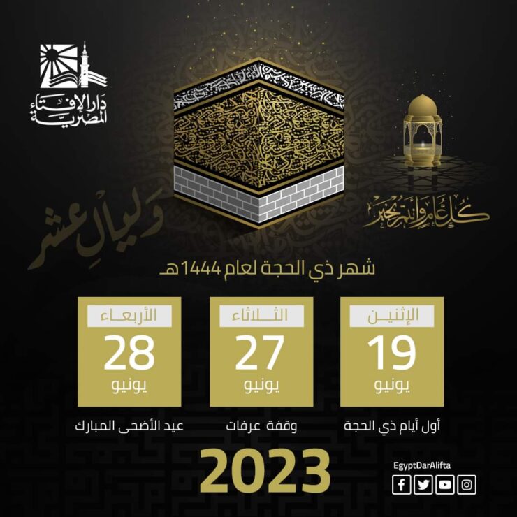 وعلى ذلك تُعلن دارُ الإفتاءِ المصريةُ أن يومَ الإثنين الموافق التاسع عشر من شهر يونيو لعام ألفين وثلاثة وعشرين ميلاديًّا هو أول أيام شهر ذي الحجة لعام ألفٍ وأربعمائةٍ وأربعة وأربعين هجريًّا.
