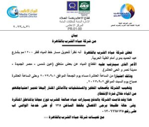 و وضحت الشركة سبب الانقطاع إلى القيام بأعمال تحويل مسار خط المياه قطر 1200مم بشارع عبد الحميد بدوى أمام الكلية الحربية.