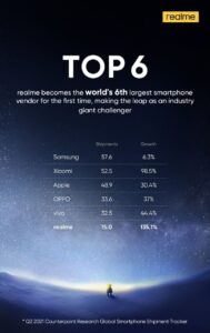 منذ بداياتها المتواضعة، وعلى مدى الخمس سنوات الماضية، حققت ريلمي نموًا مذهلاً باستخدام استراتيجيتها الذكية المعروفة بـ “الأصول الخفيفة، ووسائل القنوات القصيرة، وتفضيل التجارة الإلكترونية”، حيث تجاوزت ريلمي التوقعات وواكبت عالم الهواتف الذكية بتأثير فعّال. وفي غضون عامين فقط، حصلت ريلمي على لقب أسرع علامة تجارية نموًا في الهواتف الذكية في العالم لأربعة أرباع متتالية (عبر “كاونتربوينت”) وتصدرت التصنيف السابع في سوق الهواتف الذكية العالمي.