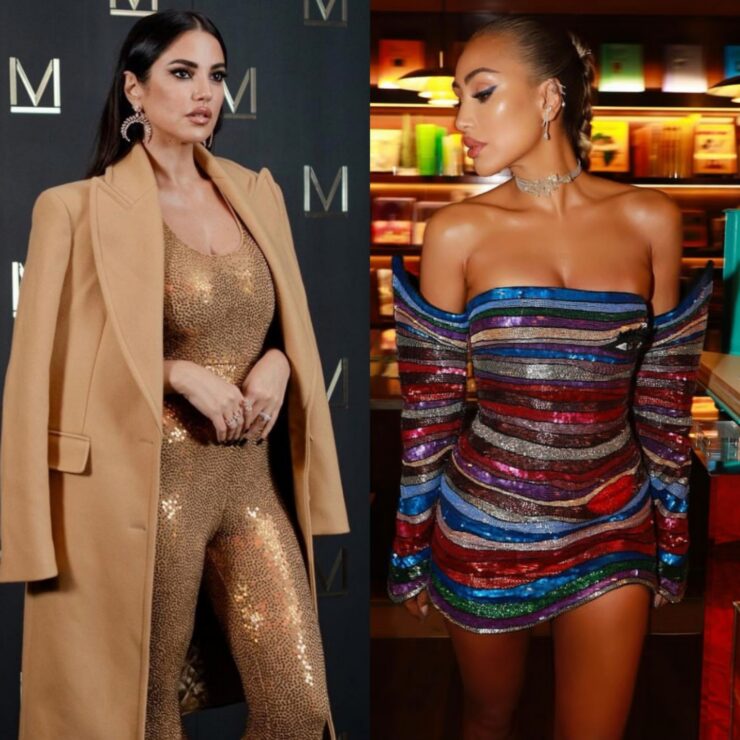 وأطلت النجمة اللبنانية على السجادة الحمراء بفستان قصير وضيق يبرز قوامها الرشيق، وتميّز بقماش الترتر البراق والملون بألوان متوهجة وجاء مفتوح عند الكتفين مع أكمام طويلة ومسننة من الأعلى على شكل قفازات من القماش نفسه، وقد نجحت مايا بلفت الأنظار إليها بحركة إضافية عبارة عن شكل عين تزيّن منطقة الصدر، وشكل شفاه تزيّن الورك
