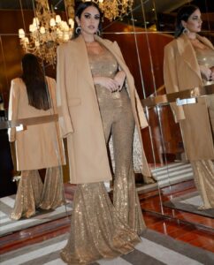 وكذلك شاركت في عرض دار المجوهرات النجمة درة زروق وإختارت إطلالة فخمة باللون الذهبي وبقماش براق، عبارة عن جمبسوت ضيق من الأعلى يبرز قوامها الممشوق ليتسع عند أسفل القدمين، ونسقته مع معطف شتوي طويل باللون البيج.