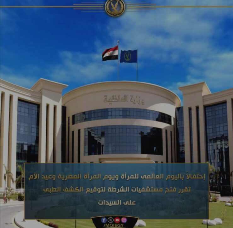 أعلنت وزارة الداخلية، فتح مستشفيات و جميع قطاعات للخدمات الطبية لتوقيع الكشف الطبي علي السيدات ، تخصيص يوم الجمعة من كل أسبوع خلال للمترددات على العيادات الخارجية في جميع التخصصات الطبية بمستشفيات الشرطة، وصرف العلاج اللازم لهن بالمجان، بمناسبة الاحتفال باليوم العالمي للمرأة ويوم المرأة المصرية وعيد الأم، وذلك خلال الفترة المسائية، بداية من الساعة 5 مساءً حتى 8 مساءً، يومي 1 و8 مارس، وبداية من الساعة 8 مساء حتى 11 مساء أيام 15 و23 و29 مارس.