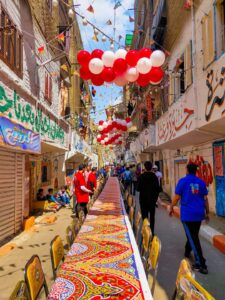 فبدأت تتزين المنطقة مع بداية شهر رمضان بأجواء رمضان الشهيرة، ورسم الجرافيتي على جدران الشوارع، وتعليق الزينة، وتجهيز الطعام والمشروبات وتوزيع المهام أيضًا على أبناء المنطقة، لكي يخرجون بأكبر مائدة إفطار في مصر، والتي أشتهرت بها منطقة عزبة حمادة بالمطرية.