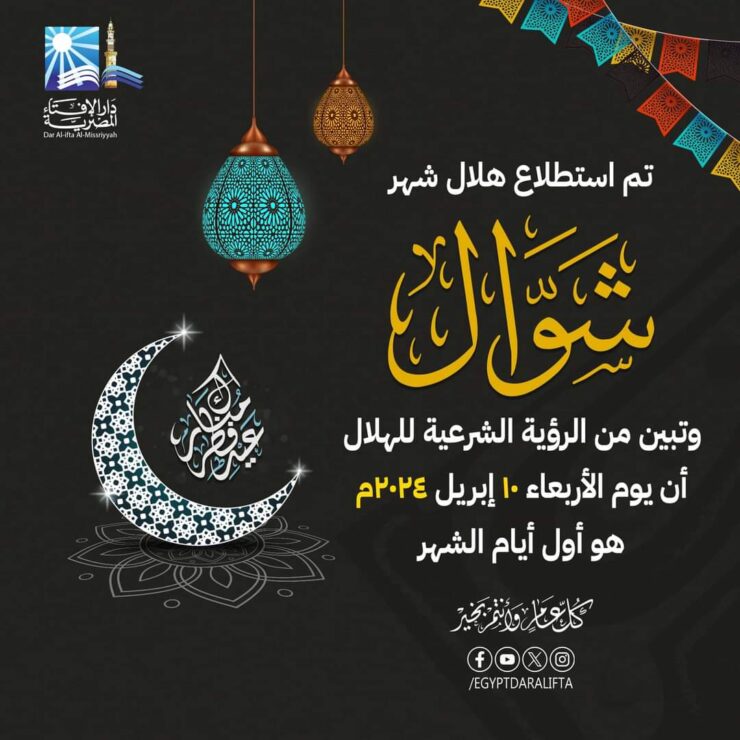 وعلى ذلك أعلنت دارُ الإفتاءِ المصريةُ أن يومَ الثلاثاء الموافق التاسع من شهر إبريل لعام ألفين وأربعة وعشرين ميلاديًّا، هو المتمم لشهر رمضان لعام ألف وأربعمائة وخمسة وأربعين هجريًّا، وأن يوم الأربعاء الموافق العاشر من شهر إبريل لعام ألفين وأربعة وعشرين ميلاديًّا هو أول أيام شهر شوال لعام ألف وأربعمائة وخمسة وأربعين هجريًّا.
