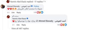 كتب على الإعلان الذي نشرته ياسمين عبر حسابها بموقع فيسبوك،”مبروك يا سمسم إعلان طرش، لترد عليه قائلة: الله يبارك فيك ياعوضيكوا.