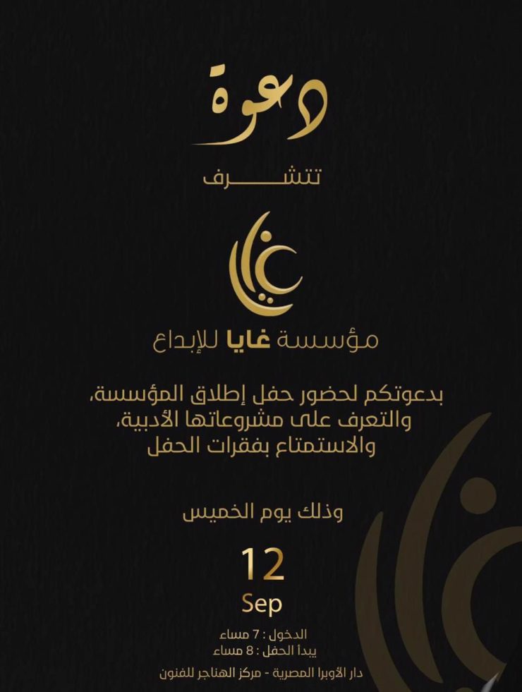 ايمانا باهمية مشاركات كيانات المجتمع المدنى فى خطط بناء الانسان وتطوير الوعى والارتقاء بالوجدان تطلق مؤسسة غايا للابداع مشروعها المبتكر الهادف الى انتاج ألوان ابداعية مختلفة وإثراء المحتوى الفنى والفكرى العربى المرئى والمسموع والمكتوب من خلال استثمار الوسائط التكنولوجية الحديثة الى جانب اكتشاف وتقديم جيل جديد من النابغين وذلك فى احتفالية فنية تقام 7 مساء الخميس 12 سبتمبر بمركز الهناجر للفنون بحضور كوكبة من سفراء الدول العربية والاجنبية ونخبة من كبار الكتاب والادباء والنقاد والفنانين والاعلاميين ويتم خلالها تكريم مجموعة من نجوم الفن والمثقفين منهم سميحة أيوب – سميرة عبدالعزيز – الدكتور أشرف زكى – الروائى الكبير صنع الله ابراهيم – اسم الاديب إبراهيم أصلان – اسم الاديب يحيى حقى ، الى جانب فقرة فنية تقدمها فرقة 3 اخوات .