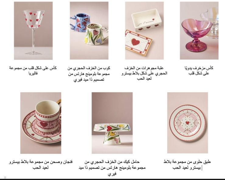 بالإضافة إلى هذا التعاون، تضم مجموعة أنثروبولوجي لعيد الحب مجموعة مختارة بعناية من القطع الرومانسية والمفعمة بالحياة. بدءًا من أدوات المائدة المستوحاة من الطراز الباريسي وحتى الأواني الزجاجية الأنيقة والديكور، تجسد المجموعة سحر الموسم الاحتفالي بألوان رومانسية من اللون الوردي والأحمر ولمسات من الفخامة بتفاصيل من الذهب عيار 24 قيراطًا.