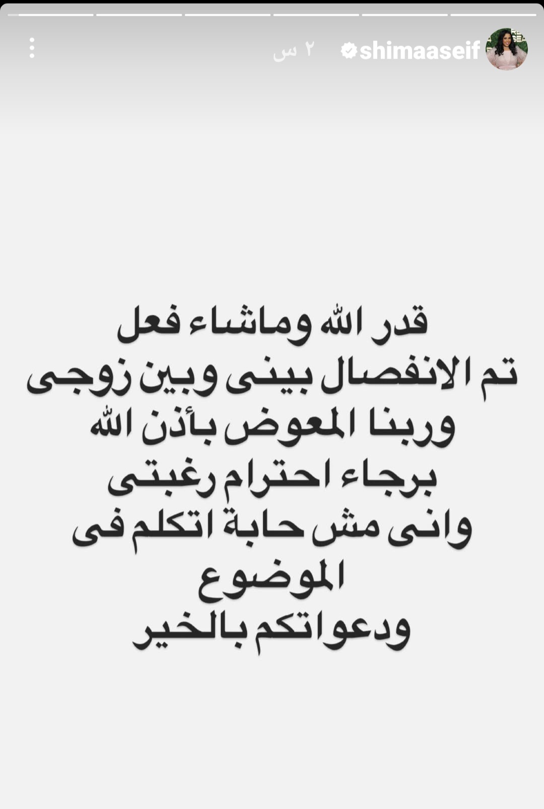 وأعلنت الخبر شيماء سيف، عن طريق خاصية الستوري عبر حسابها الرسمي عبر موقع الصور والفيديوهات “إنستجرام”، وعلقت:”قدر الله وما شاء فعل تم الانفصال بيني وبين زوجي وربنا المعوض بإذن الله برجاء احترام رغبتي وإني مش عايزة أتكلم في الموضوع ودعواتكم بالخير”.