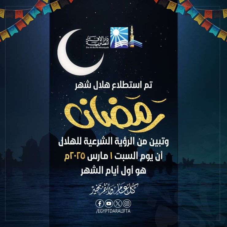 أستطلعت وزارة الأوقاف المصرية منذ قليل هلال شهر رمضان المبارك، وثبتت رؤية هلال شهر رمضان المبارك في مصر، وعليه يكون غدا السبت، هو أول أيام شهر رمضان المبارك.