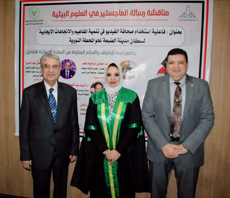 فى رسالة بحثية تعد الأولى من نوعها ، حصلت الباحثة شيرين سامى الكاتبة الصحفية بجريدة ” العالم اليوم” ، على درجة الماجستير فى العلوم البيئة ، تخصص الإعلام البيئى -كلية الدراسات العليا و البحوث البيئية جامعة عين شمس. فى رسالتها التى حملت عنوان:” فاعلية استخدام صحافة الفيديو في تنمية المفاهيم والاتجاهات البيئية لدي سكان مدينة الضبعة نحو المحطة النووية “.