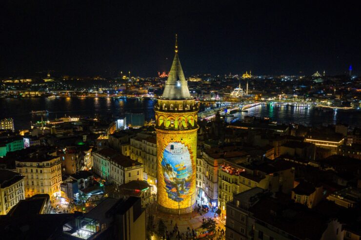 كما تزينت معالم المدينة بعروض ضوئية ثلاثية الأبعاد على برج “غلطة” وشاشات خارجية ضخمة، لتنقل أجواء الاحتفال إلى الأماكن العامة.